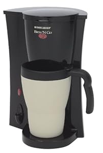 Introducing a personal coffeemaker that brews fresh, hot coffee into a thermal 15-ounce travel mug in minutes. The insulated mug is tapered; has a contoured, easy-grip handle; fits most vehicle cup holders; and the brew-thru lid is easy to drink through. The travel mug also fits all Black & Decker-brand Brew 'N Go coffeemakers. A reusable, permanent filter is included--no need for paper disposables. Conveniently, this item also heats water for tea, hot chocolate, or instant foods like soup, noodles, or oatmeal. And for peace of mind, this coffeemaker features a power "on" light with automatic shut-off. Measures 10-1/4 by 6-3/4 by 7 inches; weighs less than 2-1/2 pounds.
