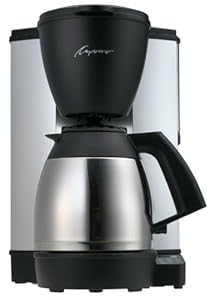 Employing a stainless-steel vacuum carafe instead of a warming plate, this 1,200-watt coffeemaker brews up to ten 5-ounce cups in just 8 minutes for maximum flavor and aroma, and the carafe then keeps the coffee hot for 4 hours. The carafe prevents coffee from turning bitter, as it can when sitting on a warming plate, and doesn't have to remain with the machine for coffee to stay hot. To reduce calcification, Capresso's stainless-steel ThermoBlock system prevents water from contacting aluminum inside the machine. Other features: a digital, programmable, 24-hour clock/timer that makes it possible to have coffee ready in the morning; an automatic pause when the carafe is removed during the brewing process for a quick pour; a charcoal water filter to remove up to 83 percent of the chlorine in tap water; an electronic indicator to show when the water filter needs replacing; a setting for brewing three to five cups without diluting flavor and aroma; a permanent Gold Tone filter; automatic shutoff after brewing; an external water-level indicator; and concealed cord storage.
