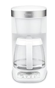 A nice addition to any busy kitchen, this easy-to-use coffeemaker brews up to 12 cups of coffee at a time and offers 24-hour programmability--great for waking up to the aroma of freshly brewed coffee. The unit provides a 1- to 4-cup setting for brewing a smaller amount without compromising flavor, and its brew-pause function allows for pouring a cup before the brew cycle has completed. The included 12-cup carafe comes with a generous stay-cool handle, a knuckle guard, and a dripless pour spout for graceful serving. Other highlights include simple push-button controls, an LCD display, a convenient water window, an easy-fill reservoir, and a 60-second reset memory function that "remembers" the settings and stage in the brewing process in case of power interruption. Accessories include a gold-tone coffee filter and a replaceable charcoal water filter for removing impurities. With its sleek, compact design that takes up minimal counter space, the coffeemaker measures approximately 12 by 9-8/9 by 17-1/2 inches and carries a three-year limited warranty.