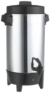 Every organization needs at least one of these large-capacity coffeemakers for group meetings. Attractive enough for a corporate ballroom, handy as all get-out for those family reunions, this model by West Bend features a highly polished aluminum case with black trim, an aluminum interior, a two-way dripless faucet, a cool-tip filter basket (no paper filter needed), and a detachable two-foot cord for easy storage. Best of all, the coffeemaker brews 12 to 42 cups quickly, up to one cup per minute. Or it can be used to heat water for tea and instant drinks. The coffeemaker stands 17 inches high and is covered with a one-year warranty. --Ann Bieri