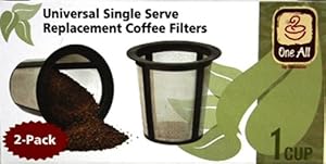 A great replacement set for worn-out originals, these two single-serve coffee filters come universally designed for use with all coffeemakers using the One All reusable single-serve coffee-filter system or Keurig-brand My K-Cup technology, including Keurig, Breville, Cuisinart, and Mr. Coffee. The reusable filters not only offer an economical and alternative to disposable filters, but they also allow for using any type of ground coffee--no need for disposable prepackaged coffee packs. Even more, the filters feature a fine mesh made of surgical-grade stainless steel, so there's never any peeling or flaking to worry about. Each filter measures 2.03 by 2.03 by 1.92 inches.