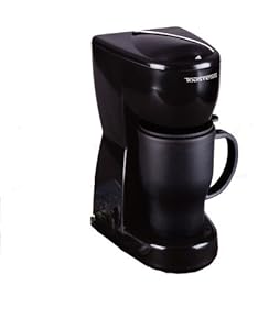Perfect for people on the go, this 450-watt single-cup personal coffeemaker quickly brews a delicious cup of coffee. Its permanent nylon coffee filter means no more time or money spent dealing with disposable filters. And in addition to making coffee, the unit also produces hot water for tea, hot cocoa, instant soups, and more. Other highlights include an "on/off" indicator light and an easy-to-clean design. The unit brews coffee directly into the included 14-ounce thermal travel mug, which fits in most car cup holders and provides a snap-tight lid to help prevent spills. The coffeemaker measures 5 by 7-2/5 by 10-1/2 inches and carries a one-year limited warranty.